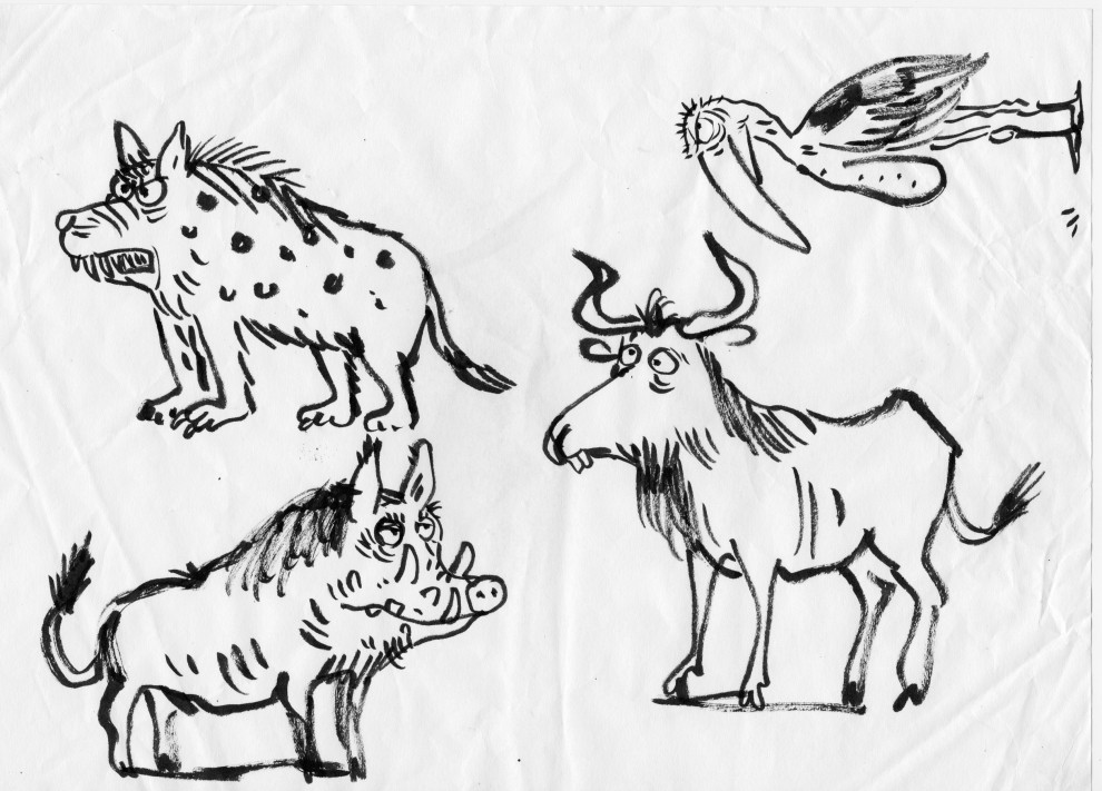 It was suggested at some point that the ugliness of the creatures should be even more extreme and exaggerated, but I felt they should look more naturalistic (as much as my drawings ever are) and that the animals - who are not really ugly - should keep their dignity.